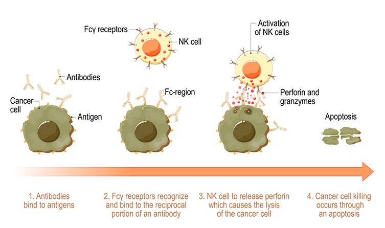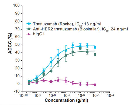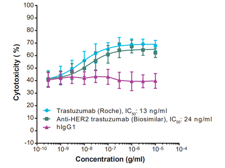 시약 및 기기 상세 항체치료제 ADCC Assay 서비스 Maker : EUROFINS DISCOVERY 항체 면역항암제의 효능을 평가하기 위한 ADCC분석서비스를 제공합니다. 프린트 제품 문의 특징 ADCC(Antibody-dependant-cell mediated cytotoxicity, 항체 의존 세포 매개 세포 독성)는 암이나 바이러스가 감염된 타겟 세포를 용해하기 위한 면역세포의 활성화를 유도하는 세포 매개 면역 방어 메커니즘입니다.항체가 암세포에 결합하여 NK 세포를 활성화시키고, 이로 인해 암세포가 사멸됩니다. Anti-HER2 ADCC assay (#300230-1)의 경우, BT-474 표적 세포와 PBMC effector cells을 이용하여 타겟 세포에 대한 cytotoxicity 를 형광으로 측정합니다. 공여자 의존성 변이의 영향을 줄이기 위해 3명의 donor로부터 얻은 PBMC를 이용하며, 검증된 Anti-HER2 Drug인 Trastuzumab를 control로 사용합니다. 다양한 표적 및 effector cell을 이용한 맞춤형 ADCC 분석을 개발해 드립니다.ADCC 원리데이터Figure 1. Flow cytometry assessment of HER2 surface expression on three breast cancer cell lines. MDA-MB-231, MCF-7 and BT-474 cells were thawed and stained with either anti-Her2-PE antibody or isotype control for 30 min followed by washing with 0.2% BSA in PBS. The HER2 surface expression was evaluated from 10,000 cells/sample by flow cytometry. BT-474 cells have a high expression level for HER2 which makes them an ideal target cell.Figure 2. Cellular cytotoxicity assays enable efficacy comparisons of trastuzumab and a biosimilar. Specific cytotoxicity is determined from percent cytotoxicity measured from an antibody of interest and an isotype matched control. Percent Cytotoxicity is calculated as: Cytotoxicity % = 100 x (1-(A-C)/ (D-C)) where A = Fluorescence intensity of test compound or reference treated group, C = Fluorescence intensity of medium only, D = Fluorescence intensity of target cell (BT-474) only.Figure 3. Specific anti-HER2 antibody-dependent cellular cytotoxicity in BT-474 cells. Fluorescence intensity decreased by ≥ 20% relative to 1 μg/ml hIgG1 isotype control indicates specific ADCC activity. Percent ADCC increases, up to a point, with increasing concentrations of trastuzumab, but not IgG. Antibodies were preincubated with Calcein AM-stained target cells (1 x 104 cells/well) for 30 min, followed by addition of PBMC effector cells. Live cell images were acquired using the ImageXpress Micro Confocal Image System; target cell cytotoxicity was quantified by fluorescence intensity. ADCC is calculated as: 100 x (1-(A-C)/ (B-C)) where A = Fluorescence intensity of test compound or reference treated group, B = Fluorescence intensity of 1 μg/ml human IgG1 treated group, C = Fluorescence intensity of medium only. 주문정보 견적문의 제품담기 주문정보 - Cat No, PRODUCT, SIZE, 수량 등 항목으로 구성되어있습니다. Product Cat.No. Size Maker Qty Data Sheet MSDS 항체치료제 특성화 분석서비스 (ADCC Assay) 899313 . EUROFINS DISCOVERY - + 보기 보기 1 Maker EUROFINS DISCOVERY Cat.No. 899313 Product 항체치료제 특성화 분석서비스 (ADCC Assay) Size . Qty - + first 1 last 추천제품 Biologics 분석을 위한 Cell based Bioassay Kit 바이오치료제 분석키트 제작 서비스 혈액면역세포 | PBMC, NK Cell, T Cells, B Cells, Dendritic Cells 항체 결합 스크리닝을 위한 Fc Receptor Stable Cell Lines Fc Receptor SPR Binding Assay 서비스 | 항체치료제 특성화 분석서비스 [R&D Systems] Glycan Labeling Kit | 글리칸 라벨링 [R&D Systems] Glycobiology Kits 관련제품 견적문의 제품담기 주문정보 - Cat No, PRODUCT, SIZE, 수량 등 항목으로 구성되어있습니다. Product Cat.No. Size Maker Qty Data Sheet MSDS 자료 웨비나/Video