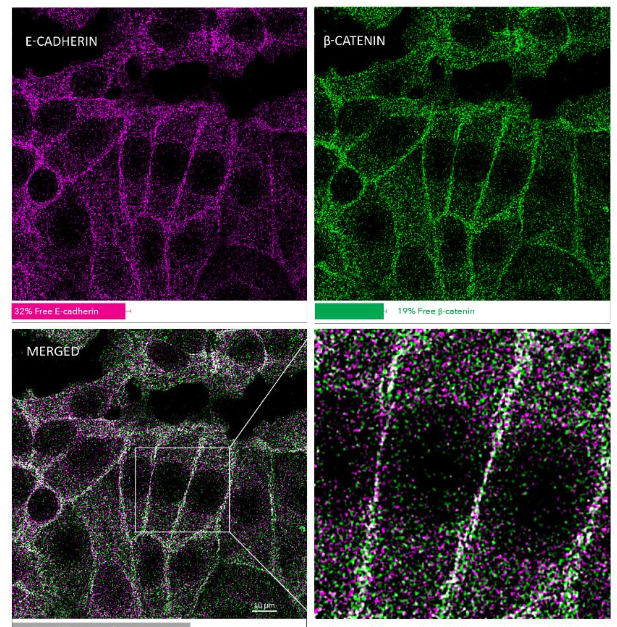 시약 및 기기 상세 [Novus] MolBoolean Mouse/Rabbit Assay Kit Maker : NOVUS BIOLOGICALS 세포 또는 조직 내에서 두가지 단백질의 개별 염색 및 두 단백질 간의 상호작용, 근접 여부를 확인할 수 있습니다. 프린트 제품 문의 특징 세포나 조직 내에서 두 개의 관심 단백질이 서로 근접해 있는지(약 40nm 이내) 확인하고 정량하는 데 이용하는 시약입니다.단백질 A, 단백질 B, A+B의 상호 작용 복합체, 3가지 상태를 동시에 정량할 수 있습니다.두가지 형광 리포터를 이용하여 590nm, 664nm에서 확인합니다.Rolling Circle Amplification (RCA)라는 증폭 방법을 사용하여, 신호 감도가 높고 미세 상호작용도 검출할 수 있습니다.120 cell assays (40 µl/assay) 혹은 60 tissue assays (80 µl/assay)가 가능합니다. Kit 구성품 Additive (40x)Blocker (4x)Buffer A (10x)Buffer B (8x)Buffer C (5x)Buffer D (10x)Circle (40x)Detection oligos (40x)Diluent (1x)Ligase enzyme (80x)Nickase enzyme (80x)Polymerase enzyme (40x)Probe A (80x)Probe B (80x)Tag oligos (40x) 실험 과정 1차 항체가 세포 내 단백질 A, B에 결합두 항체에 연결된 proximity probe가 DNA circle과 hybridizationDNA circle에 nicking (절단)Tag oligo 삽입 및 ligationRCA (rolling circle amplification) 수행 → 많은 복제된 DNA concatemer 생성형광 표지된 태그 oligo가 증폭된 DNA에 결합 → 형광 신호 검출free 단백질의 경우에는 단일 형광 신호를, A‑B 복합체의 경우에는 두가지 형광이 겹쳐 나타남 데이터 MolBoolean analysis of the interaction between E-cadherin (cat. NBP2-34475, magenta) and B-catenin (cat. NBP1-89989, green) in MCF7 cells, showing the relative quantification of free versus interacting protein fractions, indicated by the detection of rolling circle products (RCPs) in either one or two fluorescent channels. Data is normalized to total target protein levels (total RCPs). MolBoolean analysis of the interaction between ACE2 (cat. NBP2-59036, magenta) and TMPRSS2 (cat. NBP2-38263, green) in human kidney, showing the relative quantification of free versus interacting protein fractions, indicated by the detection of rolling circle products (RCPs) in either one or two fluorescent channels. Data is normalized to total target protein levels (total RCPs) 주문정보 견적문의 제품담기 주문정보 - Cat No, PRODUCT, SIZE, 수량 등 항목으로 구성되어있습니다. Product Cat.No. Size Maker Qty Data Sheet MSDS MolBoolean™ Mouse/Rabbit Assay Kit MolB00001 1 Kit NOVUS BIOLOGICALS - + 보기 보기 1 Maker NOVUS BIOLOGICALS Cat.No. MolB00001 Product MolBoolean™ Mouse/Rabbit Assay Kit Size 1 Kit Qty - + Data Sheet 보기 first 1 last 추천제품 [Novus] IHC Tissue Slides RNA In situ hybridization (ISH) 분석서비스 Immunohistochemistry 시약 (Coverslip Sealant, PAP Pen) 세포 염색시약 가이드 | Live Cell Staining Dye [R&D Systems] Avi-tag, Amine-Labeled Biotinylated Proteins 관련제품 견적문의 제품담기 주문정보 - Cat No, PRODUCT, SIZE, 수량 등 항목으로 구성되어있습니다. Product Cat.No. Size Maker Qty Data Sheet MSDS 자료 웨비나/Video