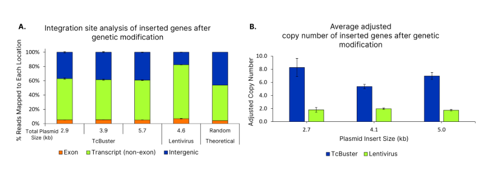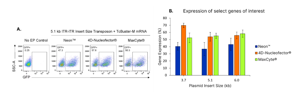 시약 및 기기 상세 [R&D Systems] 유전자 도입을 위한 non-viral TcBuster mRNA Transposase & Transposon Maker : R&D SYSTEMS TcBuster 시스템은 바이러스를 사용하지 않고 유전자를 세포내로 전달하는 방법으로, 유전자 전달 효율이 높고 안전하여, 세포치료제 개발에 효율적으로 적용될 수 있습니다. 프린트 제품 문의 특징TcBuster는 여러 개의 관심 유전자를 세포내로 전달하고 안정적으로 삽입할 수 있는 대용량 Transposon 시스템입니다. TcBuster는 CAR T 또는 CAR NK와 같은 세포 치료제 개발 과정에서 상당한 시간과 비용 절감을 제공합니다.TcBuster 시스템은 바이러스 대신 electroporation 방법을 사용하여 유전자를 삽입합니다. TcBuster 시스템이 바이러스 기반 시스템과 다른 점 세포 치료제의 시장 출시 기간 단축 및 비용 절감증가된 cargo capacity, 높은 편집 효율, 단일 벡터에서 여러 유전자 전달위험성이 낮은 삽입 프로파일을 통한 안정적인 DNA 발현RUO 및 GMP 등급 재료 모두에 대한 강력하고 안정적인 공급배치 간 변동성 감소 및 바이러스 전처리 없이 연구 단계부터 임상 및 상업 단계까지 손쉽게 확장 가능유연하고 비독점적인 라이선스 옵션과 탄탄한 기술 및 규제 지원 TcBuster Reagent Product Cat. No. Product Test size Application TcBuster™-M Transposase mRNA TCB-001.1-100 (100 µg) TcBuster™-M Transposase mRNA 100 tests at 1 µg each 초기 평가시 유용 TCB-001.1-500 (500 µg) TcBuster™-M Transposase mRNA 500 tests at 1 µg each Large scale 이용시 유용 TCB-001.1-GMP (500 µg) TcBuster™-M GMP Transposase mRNA 500 tests at 1 µg each GMP 등급으로, pre-IND, ex vivo clinical applications에 유용 TcBuster-Compatible Transposons TCBP001-100 (100 µg) TcBuster™ Transposon CD19CAR-DHFR-eGFP 25-100 tests at 1-4 µg each Multicistronic CAR-containing transposon으로 cell therapy에서 대조군으로 유용 TCBP002-100 (100 µg) TcBuster™ Transposon Insert On eGFP 25-100 tests at 1-4 µg each Immortalized cell의 실험 대조군으로서 생물공정 시스템 평가에 유용 Transposease Antibody MAB11511 (25 µg, 100 µg) Anti-TcBuster-M Transposase Antibody 1 µg/mL for WB TcBuster-M transposase enzyme을 WB으로 확인할때 사용 TcBuster 원리 1) TcBuster 시약은 mRNA 전위효소(transposase)와 DNA 전위인자(transposon)로 구성되며, 전기천공법(electroporation)을 통해 세포 내로 도입됩니다.2) 세포 내로 들어가면 TcBuster mRNA는 전위효소 단백질 (TcBuster transposase)로 번역됩니다.3) 전위효소는 DNA transposon 내 유전자 관심 부위(GOI)를 감싸는 특정 부위인 역말단 반복서열(ITR, inverted terminal repeats)에 결합합니다.4) TcBuster는 transposon으로부터 DNA 운반체(cargo)를 절단해냅니다.5) TcBuster transposase는 DNA 운반체를 숙주 세포의 게놈 내 AT 뉴클레오타이드 부위에 무작위로 삽입합니다.6) 삽입된 DNA 운반체는 mRNA로 전사되고,7) 이후 단백질로 번역되어 안정적인 유전자 발현을 일으킵니다.사용 결과서로 다른 크기의 cargo를 여러가지 electroporation 기기를 이용하여 효과적으로 T cell에 도입하였습니다. 세 명의 공여자로부터 얻은 primary T 세포는 유전적 조작 후 GMP 등급의 Human T Cell Media(Catalog # CCM038-GMP-1L)에 5% hAB 혈청과 IL-7, IL-15 각각 10 ng/mL(Catalog # BT-007-GMP, BT-015-GMP)를 보충하여 6 well G-Rex®에서 7일간 배양합니다.(A) 5.1 kb 크기의 GFP 서열을 포함한 유전물질을 ThermoFisher Neon™, Lonza 4D-Nucleofector®, MaxCyte®의 서로 다른 일렉트로포레이션 플랫폼을 통해 T 세포에 도입한 후, 유전자 변형된 T 세포의 대표적인 유세포 분석 결과를 보여줍니다.(B) 세 가지 다른 크기의 DNA cargo를 동일한 electroporation 플랫폼에 도입한 결과, T 세포에서 모두 40% 이상의 높은 유전자 편집 효율을 달성합니다. 데이터 포인트는 세 명의 공여자로부터 얻은 평균값이며, 각 조건은 기술적 중복으로 수행된 결과에 표준편차(± SD)를 포함하여 나타냅니다.TcBuster로 유전자가 편집된 CD19-CAR-T 세포는 낮은 E:T 비율에서도 CD19+ 표적 세포를 선택적으로 제거하였습니다.3명의 공여자로부터 얻은 T 세포는 유전 조작 후, GMP 등급의 T 세포 배지(Catalog # CCM038-GMP-1L)에 5% hAB 혈청과 IL-7, IL-15 각각 10 ng/mL를 보충하여 6 well G-Rex®에서 7일간 배양하였습니다.(A) TcBuster는 electroporation 플랫폼에 관계없이 다양한 크기의 유전물질을 효율적으로 삽입하며, 그 결과 유사한 수의 유전자 변형 T 세포를 생성합니다.(B) 5.1 kb 플라스미드로 조작된 T 세포는 electroporation 후 7일간 배양한 뒤 CS10에 냉동 보관하며, 해동 즉시 CD19+ 또는 CD19− 표적 세포에 다양한 E:T 비율로 처리한 결과, 24시간 공동 배양 후 CD19+ 세포의 성장을 효과적으로 억제합니다.TcBuster로 유전적으로 조작된 primary T 세포의 유전적 특성을 분석한 결과, 삽입 양상이 양호하고 낮은 벡터 copy number를 보였습니다.(A) 세 명의 공여자로부터 얻은 T 세포는 배양 9일 후 채취하여, Digital PCR을 통해 평균 보정 벡터 사본 수(VCN)를 분석하였습니다. (B) 삽입 부위 분석(Integration Site Analysis, ISA)은 TcBuster 또는 렌티바이러스를 사용하여 다양한 크기의 플라스미드를 도입한 세 명의 공여자 T 세포를 대상으로 수행하며, DNA 라이브러리는 GeneWerk(ProtaGene)에서 Illumina 시퀀싱으로 분석하였습니다.TcBuster는 렌티바이러스와 동등하거나 더 높은 효율로 T 세포를 편집합니다.세 명의 공여자로부터 얻은 T 세포는 GMP 등