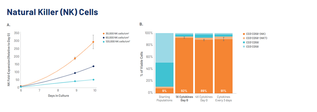 A) 인간 NK 세포를 G-Rex6M well plate에 정해진 세포 밀도로 접종하였습니다. 그 결과, 3x10⁴ cells/cm²의 조건에서 배양 10일 후 약 300배의 증식을 보여 가장 우수한 증식 결과를 나타냈습니다.