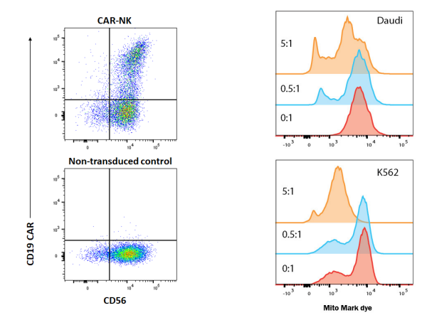 시약 및 기기 상세 [R&D Systems] FlowX Human NK Cell Killing Flow Cytometry Kit Maker : R&D SYSTEMS Natural Killer Cell의 타겟 세포 사멸 능력을 유세포 분석 방법으로 모니터링하기 위한 항체와 염료 키트입니다. 프린트 제품 문의 특징 타겟 세포에 작용하는 Natural Killer Cell의 세포 사멸 능력을 유세포 분석 방법으로 확인하기 위한 kit입니다.Natural Killer (NK) cells과 Target cells을 표지하기 위한 염료, cell viability를 확인하기 위한 염료, 정량화를 위한 cell count particles, 3가지 형광처리 항체, NK 세포가 표적세포를 사멸시키는 것을 모니터링 하기 위한 유세포 분석용 염색 및 fixation buffer가 제공됩니다. 세포 독성을 평가하기 위한 LAMP-1 항체가 함께 제공됩니다. CAR-NK 혹은 NK Cells에 적용할 수 있습니다.방사성 동위원소를 사용하지 않아 사용이 수월합니다. 구성품 Flow Cytometry Staining Buffer Flow Cytometry Fixation Buffer Cell Count ParticlesBuffered Detergent DMSO hCD3ε Alexa Fluor® 405 antibody hLAMP-1/CD107a PE antibody mIgG2b PE antibody hCD56 Alexa Fluor® 700 antibody Mito Mark Target Cell Dye Janelia Fluor® NK Cell Dye Viability Staining Dye Component Emission Filter Component Emission Filter Mito Mark Target Cell Dye FITC hCD3ε Alexa Fluor 405 antibody Alexa Fluor 405 Janelia Fluor NK Cell Dye APC hLAMP-1/CD107a PE antibody PE Viability Staining Dye AmCyan hCD56 Alexa Fluor 700 antibody Alexa Fluor 700 데이터Graphical representation of killing by NK cell effectors. Gating for the Mito Mark dye histograms is done as follows: gate on All cells, then gate on the non-NKs (Janelia Fluor 646 negative/CD56 Alex Fluor 700 negative). This ensures that NKs are not included in the Mito Mark histograms. The graph depicts K562 killing normalized to K562 cells alone (0:1). The relative percentage of NK killing is shown at 0.5:1 and 5:1 Effector to Target ratios (see histograms).CAR-NKs as Effective Killers.Human NK cells were enriched from PBMCs and transduced with CD19 CAR (CAR-NK). CAR-NK expression was determined using recombinant human CD19-Atto 647N (ATM9269) and hCD56 PE Monoclonal Antibody (R&D Systems®, # FAB24086P). CAR-NKs were labeled with Janelia Fluor, Daudi target cells or K562 target cells werelabeled with Mito Mark Green, and cells were co-incubated for 2 hours at Effector to Target ratios. Anti-LAMP PE Antibody (R&D Systems, # IC4800P) was included in the culture during the 2 hour killing assay. Cells were harvested and stained with hCD56 and hCD3. 주문정보 견적문의 제품담기 주문정보 - Cat No, PRODUCT, SIZE, 수량 등 항목으로 구성되어있습니다. Product Cat.No. Size Maker Qty Data Sheet MSDS FlowX Human NK Cell Killing Flow Cytometry Kit FMC032 100 Tests R&D SYSTEMS - + 보기 보기 1 Maker R&D SYSTEMS Cat.No. FMC032 Product FlowX Human NK Cell Killing Flow Cytometry Kit Size 100 Tests Qty - + Data Sheet 보기 first 1 last 추천제품 Cytek® Guava® easyCyte™ Flow Cytometer [R&D Systems] Flow Cytometry 시약 [R&D Systems] Multi-color Flow Cytometry Kit 혈액면역세포 | PBMC, NK Cell, T Cells, B Cells, Dendritic Cells [R&D Systems] Flow Cytometry Workflow 추천제품 관련제품 견적문의 제품담기 주문정보 - Cat No, PRODUCT, SIZE, 수량 등 항목으로 구성되어있습니다. Product Cat.No. Size Maker Qty Data Sheet MSDS 자료 웨비나/Video