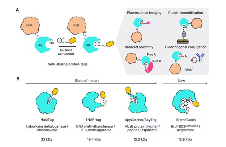 시약 및 기기 상세 [TOCRIS] BromoCatch™ Platform | SLP 태그 (자가표지 태그) 시스템 Maker : TOCRIS BromoCatch™은 스스로 표지가 가능한 혁신적인 태그 기술로, 전통적인 형광 단백질(GFP 등)을 능가하는 새로운 Live cell imaging 기법입니다. 프린트 제품 문의 특징 SLP (Self-Labelling Protein) tag 기술은 관심 있는 단백질에 특별한 tag을 붙이고 이 tag에만 반응하는 특수한 분자(ligand)를 붙여서 단백질을 형광으로 표지하는 기술입니다. 대표적인 SLP 기술로 HalogTag과 SNAP-tag이 있으나, 붙일 수 있는 tag 사이즈가 20-30kDa으로 커서, 단백질의 기능을 방해할 수 있고, 세포에 따라 반응 효율이 낮고, 일부 tag는 살아있는 세포에서는 반응이 안될 수 있으며, 여러개의 tag를 동시에 사용하는 것이 어렵거나 제한적이라는 단점이 있습니다. BromoCatch™는 이러한 기존 SLP tag의 한계를 극복한, 빠르고 안정적인 단백질 표지를 가능하게 하는 새로운 공유 결합형 단백질 태그 플랫폼입니다.이 플랫폼은 13 kDa 정도로 작은 Bromodomain을 기반으로 합니다.Nucleophilic cysteine이 엔지니어링되어 있어 공유결합 리간드 결합이 가능합니다.빠르고, 특이적이며, 안정적인 단백질 표지와 다중 태그 (multiplexed tag)을 가능하게 합니다.BromoCatch™ 융합 단백질을 살아있는 세포, 고정된 세포, 또는 세포 lysate 내에서 비가역적(irreversible)으로 표지할 수 있게 합니다. 장점 태그를 붙여도 원래 단백질의 구조나 기능에 영향을 거의 주지 않습니다.세포 내 다른 생체 분자와 반응하지 않고, 오직 표적 (Tag-ligand)과만 특이적으로 반응합니다.형광이미징, 특정 단백질 분리를 위한 affinity pull down, 표적분해, 생체접합, 분석법 개발 등에 이용됩니다.생화학적 분석법과 살아있는 세포 실험(live cell experiments) 모두에 사용될 수 있습니다.단백질-단백질 상호작용 연구를 위한 FRET(형광 공명 에너지 전달) 분석에 적합합니다. 단백질 분석 및 조작을 위한 자기 표지 태그(Self-labeling tag) 플랫폼A. Self labeling tag 원리 B. 기존의 self-labeling protein tag과 BromoCatch 비교 주요 제품 Cat. No. Product Activity 8939 Biotin BromoCatch™ Ligand A biotinylated covalent ligand for BromoCatch-tagged proteins, enabling selective and irreversible biotin labeling for pull-down and detection applications in cell lysates. 7300 BromoCatch™ Control Ligand Control ligand for use with BromoCatch™, a Self-Labeling Proteins (SLPs) tag platform 8940 BromoCatch™ Ligand, Alkyne Clickable alkyne-functionalized covalent probe for BromoCatch-tagged proteins 8937 Janelia Fluor® 635, BromoCatch™ Ligand Fluorogenic Janelia Fluor® 635 conjugated covalent ligand for BromoCatch™, enabling no-wash live-cell imaging 주문정보 견적문의 제품담기 주문정보 - Cat No, PRODUCT, SIZE, 수량 등 항목으로 구성되어있습니다. Product Cat.No. Size Maker Qty Data Sheet MSDS Biotin BromoCatch™ Ligand 8939 50ug TOCRIS - + 보기 보기 BromoCatch™ Control Ligand 7300 100 µg TOCRIS - + 보기 보기 BromoCatch™ Ligand, Alkyne 8940 50ug TOCRIS - + 보기 보기 Janelia Fluor® 635, BromoCatch™ Ligand 8937 10 µg TOCRIS - + 보기 보기 1 Maker TOCRIS Cat.No. 8939 Product Biotin BromoCatch™ Ligand Size 50ug Qty - + Data Sheet 보기 MSDS 보기 2 Maker TOCRIS Cat.No. 7300 Product BromoCatch™ Control Ligand Size 100 µg Qty - + Data Sheet 보기 MSDS 보기 3 Maker TOCRIS Cat.No. 8940 Product BromoCatch™ Ligand, Alkyne Size 50ug Qty - + Data Sheet 보기 MSDS 보기 4 Maker TOCRIS Cat.No. 8937 Product Janelia Fluor® 635, BromoCatch™ Ligand Size 10 µg Qty - + Data Sheet 보기 MSDS 보기 first 1 last 추천제품 Janelia Fluor® Dyes | 형광 Dyes [TOCRIS] 표적단백질 분해기술 | PROTAC® Degraders & Linkers [R&D Systems] Avi-tag, Amine-Labeled Biotinylated Proteins [R&D Systems] Glycan Labeling Kit | 글리칸 라벨링 [Novus] Lightning-Link Antibody Labeling Kits [R&D Systems] Fluorokines | 형광염료가 결합된 활성 단백질 관련제품 견적문의 제품담기 주문정보 - Cat No, PRODUCT, SIZE, 수량 등 항목으로 구성되어있습니다. Product Cat.No. Size Maker Qty Data Sheet MSDS 자료 웨비나/Video