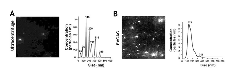 시약 및 기기 상세 [Novus] 엑소좀 정제 시약 | evGAG - Extracellular Vesicles Purification Kit Maker : NOVUS BIOLOGICALS 혈장, 혈청, 소변 등 다양한 biofluids로부터 EV, 특히 엑소좀(Exosomes)을 신속하고 효율적으로 정제하기 위한 시약입니다. 프린트 제품 문의 특징 복잡하고 시간이 오래 걸리는 초원심분리(Ultracentrifugation) 없이, biofluid에서 EVs를 빠르고 간단하게 분리 및 정제하기 위한 시약입니다.혈장, 혈청, 소변, 뇌척수액, 기관지폐포세척액 (BALF)등 다양한 생체 시료에 적용됩니다.총 소요시간은 20분입니다.정제된 EV는 pellet 형태로 회수됩니다. 20번 사용할 수 있는 양의 evGAG liquid가 제공됩니다. evGAG 키트로 정제된 EVs 펠렛은 적절한 완충액(예: PBS 1x)으로 재현탁한 후, WB, ELISA, Flow cytometry, mRNA, NGS등 다양한 분석에 바로 사용할 수 있습니다. 원리 EVs (엑소좀 포함)의 표면에는 글리코사미노글리칸(Glycosaminoglycans, GAGs)이라는 음전하를 띠는 물질이 존재합니다. evGAG 시약은 특정 양전하를 띠며, EVs 표면의 음전하와 반응하여 GAGs를 중화시킵니다.전하가 중화되면서 EVs가 서로 응집되어 큰 복합체(complex)를 형성합니다. 형성된 응집체는 저속 원심분리(3,000g 정도)만으로도 펠렛 형태로 쉽게 분리됩니다. 데이터Flow Cytometry: evGAG - Extracellular Vesicles Purification Kit [NBP3-41044] - Analysis of EVs isolated using evGAG from 50 ul of plasma or serum and 3 ml of urine. Primary antibodies used in the example: anti-CD9, anti-CD63, anti-ALIX (Catalog # NBP3-18364), anti-TSG101, anti-HSP70. evGAG - Extracellular Vesicles Purification Kit [NBP3-41044] - Nanoparticle tracking analysis (NTA) image of urine isolated EVs showing particle size (nm) and concentration (particles/ml) comparing EVs isolated by (A) ultracentrifugation or by (B) evGAG. 주문정보 견적문의 제품담기 주문정보 - Cat No, PRODUCT, SIZE, 수량 등 항목으로 구성되어있습니다. Product Cat.No. Size Maker Qty Data Sheet MSDS evGAG - Extracellular Vesicles Purification Kit (1 Kit) NBP3-41044 1 Kit NOVUS BIOLOGICALS - + 보기 보기 1 Maker NOVUS BIOLOGICALS Cat.No. NBP3-41044 Product evGAG - Extracellular Vesicles Purification Kit (1 Kit) Size 1 Kit Qty - + Data Sheet 보기 first 1 last 추천제품 [Novus] Exosome Isolation | 엑소좀 분리 컬럼, 비드, 침전용액 [Novus] Exosome Detection Antibody Pack [Novus] Exosome RNA (Pre-Isolated Exosomes) Extraction Kit [Novus] Exosome Standards 엑소좀 리피도믹스 분석 | Exosome Lipidomics 관련제품 견적문의 제품담기 주문정보 - Cat No, PRODUCT, SIZE, 수량 등 항목으로 구성되어있습니다. Product Cat.No. Size Maker Qty Data Sheet MSDS 자료 웨비나/Video