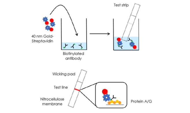 시약 및 기기 상세 [Novus] Biotin Check&Go! Control Kit Maker : NOVUS BIOLOGICALS Membrane strip을 사용하여 Biotin labeling이 성공적으로 이루어졌는지를 빠르고 간편하게 확인하기 위한 kit 입니다. 프린트 제품 문의 특징 항체나 기타 단백질에 바이오틴(Biotin)을 conjugation하는 과정이 성공했는지 단 10분 내에 확인합니다.ELISA, WB, 면역형광염색시, 시간과 시약 낭비를 방지합니다.기존의 biotin 정량 방법인 HABA 분석법에 비해, 소량의 샘플만 필요하며 훨씬 빠르고 간편합니다. 원리 Biotinylated antibody와 streptavidin-Gold conjugate가 결합하여 복합체를 형성합니다.이 복합체가 nitrocellulose 멤브레인을 따라 흐릅니다.strip의 test line에는 Protein A/G가 코팅되어 있으므로, 항체에 biotin이 잘 라벨링이 되었다면, Biotin-antibody-gold 복합체가 이 부분에 결합하여 붉은 선을 나타냅니다. Kit의 구성 1 vial of 40 nm Innova Coat® GOLD Streptavidin1 vial of Positive Control2 cryovials of 10x Running Buffer30 Protein A/G StripsNot supplied: 96-wells low binding plate Bovine serum albumin (BSA) 주문정보 견적문의 제품담기 주문정보 - Cat No, PRODUCT, SIZE, 수량 등 항목으로 구성되어있습니다. Product Cat.No. Size Maker Qty Data Sheet MSDS Biotin Check&Go! Control Kit (30 Tests) 4001-0030 30 Tests NOVUS BIOLOGICALS - + 보기 보기 1 Maker NOVUS BIOLOGICALS Cat.No. 4001-0030 Product Biotin Check&Go! Control Kit (30 Tests) Size 30 Tests Qty - + Data Sheet 보기 first 1 last 추천제품 [Novus] Lightning-Link Antibody Labeling Kits [R&D Systems] Avi-tag, Amine-Labeled Biotinylated Proteins CF Dye Protein Labeling Kit | Biotin SE Protein Labeling Kit [Novus] Primary Antibody | 1차 항체 [R&D Systems] Antibody 관련제품 견적문의 제품담기 주문정보 - Cat No, PRODUCT, SIZE, 수량 등 항목으로 구성되어있습니다. Product Cat.No. Size Maker Qty Data Sheet MSDS 자료 웨비나/Video